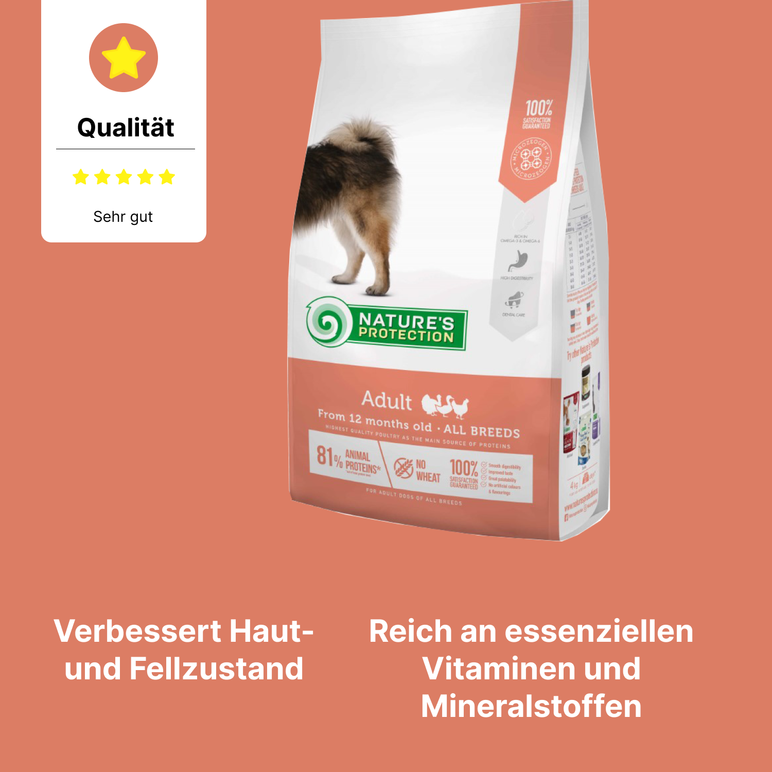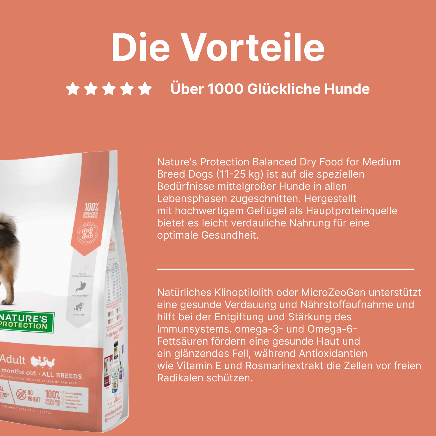 Zusammensetzung: Geflügelfleisch 38 % (getrocknet und fein gemahlen), Reis, Geflügelfett, Garneelenmehl (mind. 4 %), Maiskleber, Fischmehl, Leinsamen, Erbsen, Trockeneier, Zuckerrübenschnitzel, dynamisches mikronisiertes Klinoptilolith (1 %), Natriumhexametaphosphat, Zichorien-Extrakt, Mojave-Yucca.